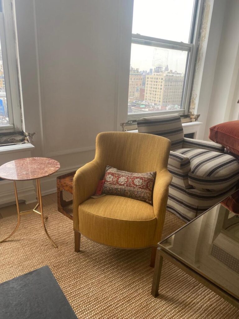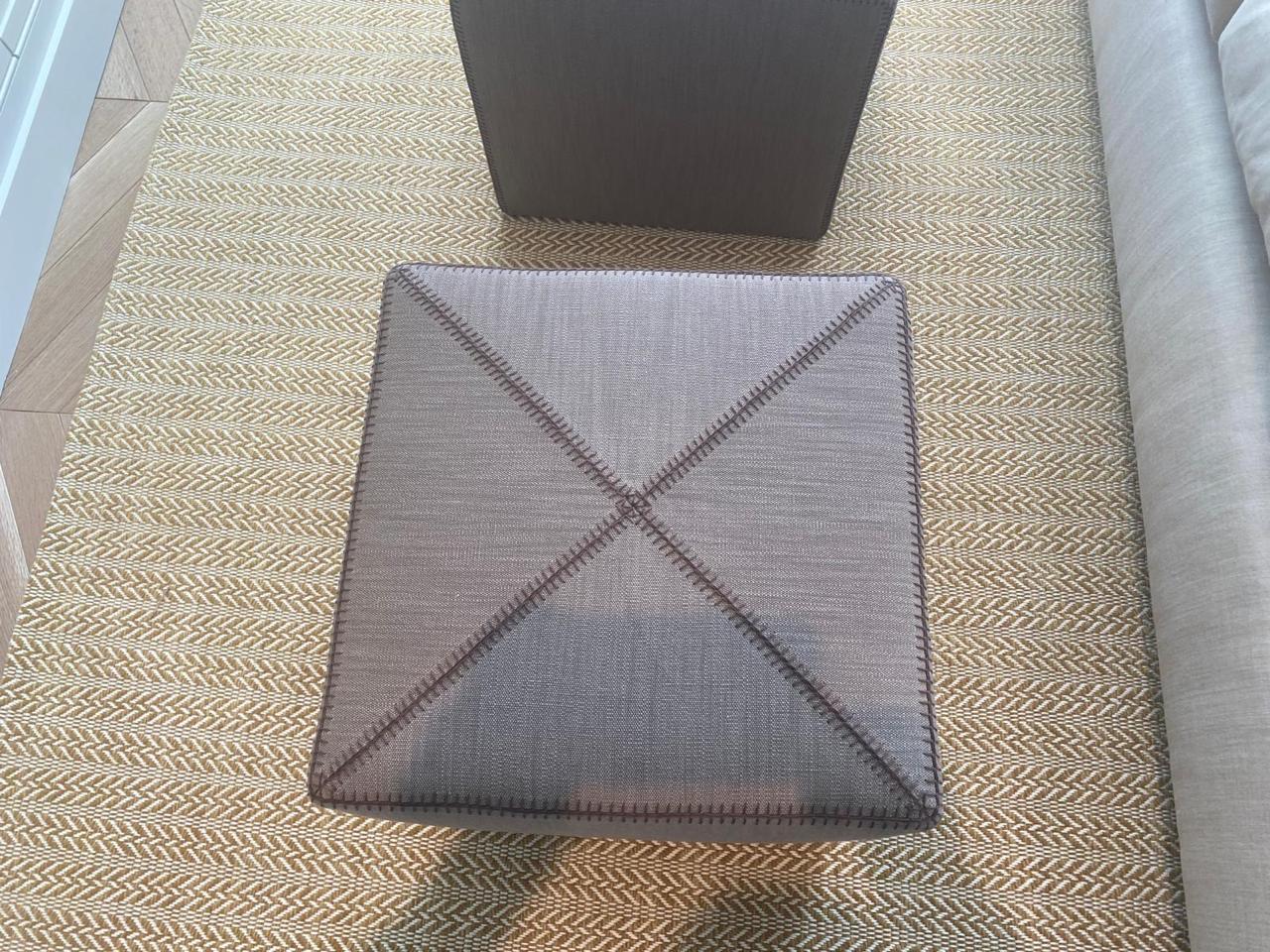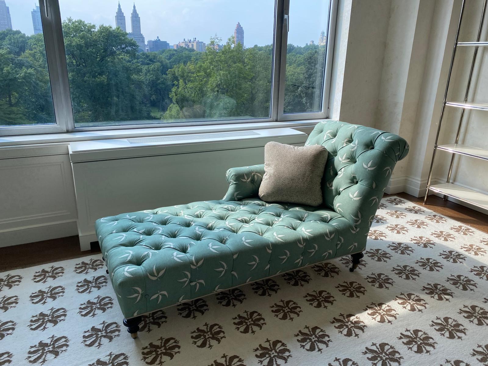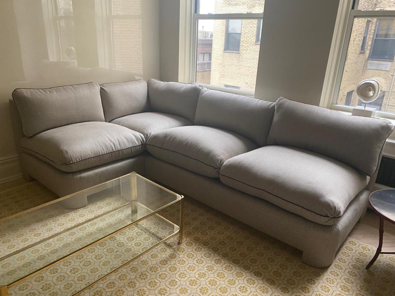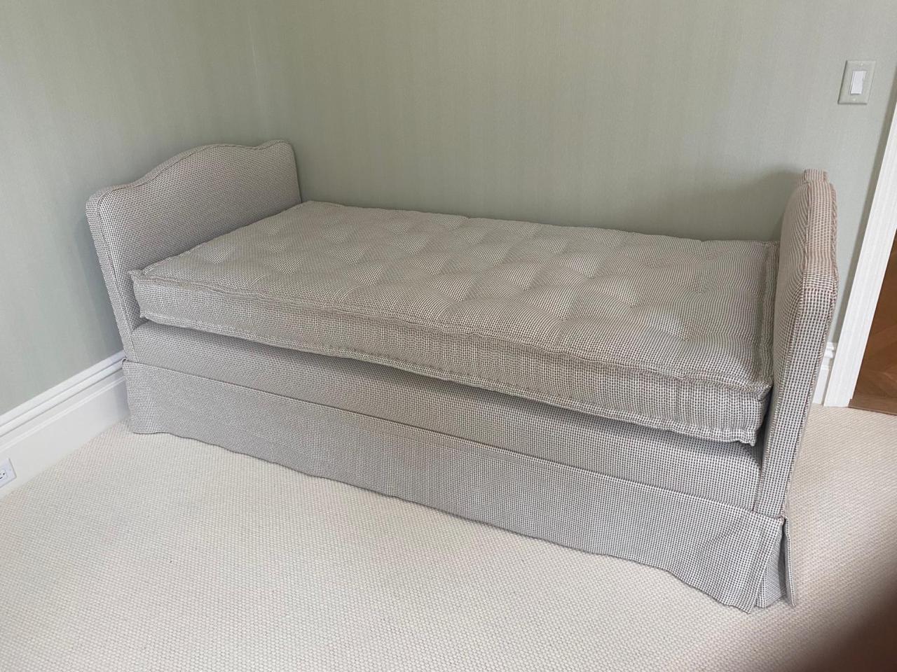 Restoration of new furniture with striped fabric upholstery, now covered with new fabric.